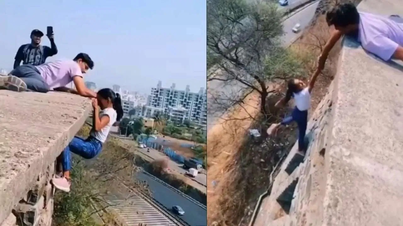 ಪುಣೆ : ಯುವತಿಯೊಬ್ಬಳು ಅಪಾಯಕಾರಿ ಸಾಹಸ ಪ್ರದರ್ಶಿಸಿದ ವೀಡಿಯೋ ಸಾಮಾಜಿಕ ಜಾಲತಾಣಗಳಲ್ಲಿ ವೈರಲ್ ಆಗಿದೆ. ಪುಣೆಯ ಸ್ವಾಮಿ ನಾರಾಯಣ ದೇವಸ್ಥಾನದ ಬಳಿಯಿರುವ ಪಾಳು ಬಿದ್ದ ಬಹು ಮಹಡಿಯ ಕಟ್ಟಡದಲ್ಲಿ ಚಿತ್ರೀಕರಿಸಲಾಗಿದ್ದು, ಯುವಕನೊಬ್ಬನ ಕೈ ಹಿಡಿದು ಯುವತಿ ನೇತಾಡುತ್ತಿರುವುದನ್ನು ಕಾಣಬಹುದು.