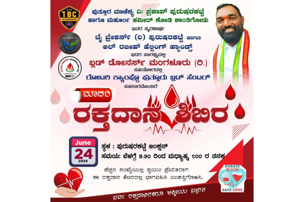 ದಿ|ಪ್ರಕಾಶ್ ಪುರುಷರಕಟ್ಟೆ ಹಾಗೂ ಮರ್ಹೂಂ ಹಮೀದ್ ಕೋಡಿ ಶಾಂತಿಗೋಡು ಇವರ ಸ್ಮರಣಾರ್ಥ ಟೈ ಬ್ರೇಕರ್ಸ್ (ರಿ) ಪುರುಷರಕಟ್ಟೆ ಹಾಗೂ ಅಲ್ ರಬೀಹ್ ಹೆಲ್ಪಿಂಗ್ ಹ್ಯಾಂಡ್ಸ್ ಇದರ ಜಂಟಿ ಸಾರಥ್ಯದಲ್ಲಿ ಬ್ಲಡ್ ಡೋನರ್ಸ್ ಮಂಗಳೂರು (ರಿ.) ಸಹಯೋಗದಲ್ಲಿ ರೋಟರಿ ಕ್ಯಾಂಪ್ಕೊ ಪುತ್ತೂರು ಬ್ಲಡ್ ಸೆಂಟರ್ ಸಹಕಾರದೊಂದಿಗೆ ಮಾದರಿ ರಕ್ತದಾನ ಶಿಬಿರವು ಜೂ.24(ಸೋಮವಾರ) ಪುರುಷರಕಟ್ಟೆ ಜಂಕ್ಷನ್ ನಲ್ಲಿ ಬೆಳಗ್ಗೆ 9.00 ರಿಂದ ಮಧ್ಯಾಹ್ನ 1:00 ರ ತನಕ ನಡೆಯಲಿದೆ.