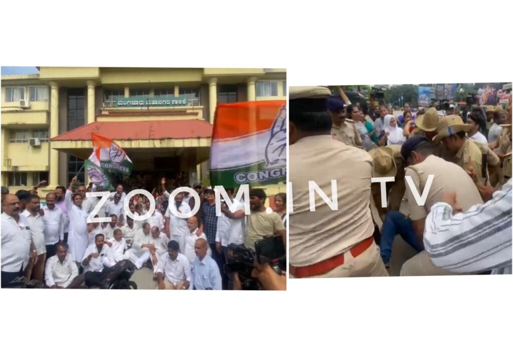 ಮಂಗಳೂರು ಪಾಲಿಕೆ ಎದುರು ಕಾಂಗ್ರೆಸ್ ಕಾರ್ಯಕರ್ತರು ರಸ್ತೆ ತಡೆದು ಪ್ರತಿಭಟನೆ ನಡೆಸಿದ್ದು, ಲಾಲ್ ಭಾಗ್ ಸರ್ಕಲ್ ಬಳಿ ಟ್ರಾಫಿಕ್ ಜಾಂ ಉಂಟಾಗಿದೆ.