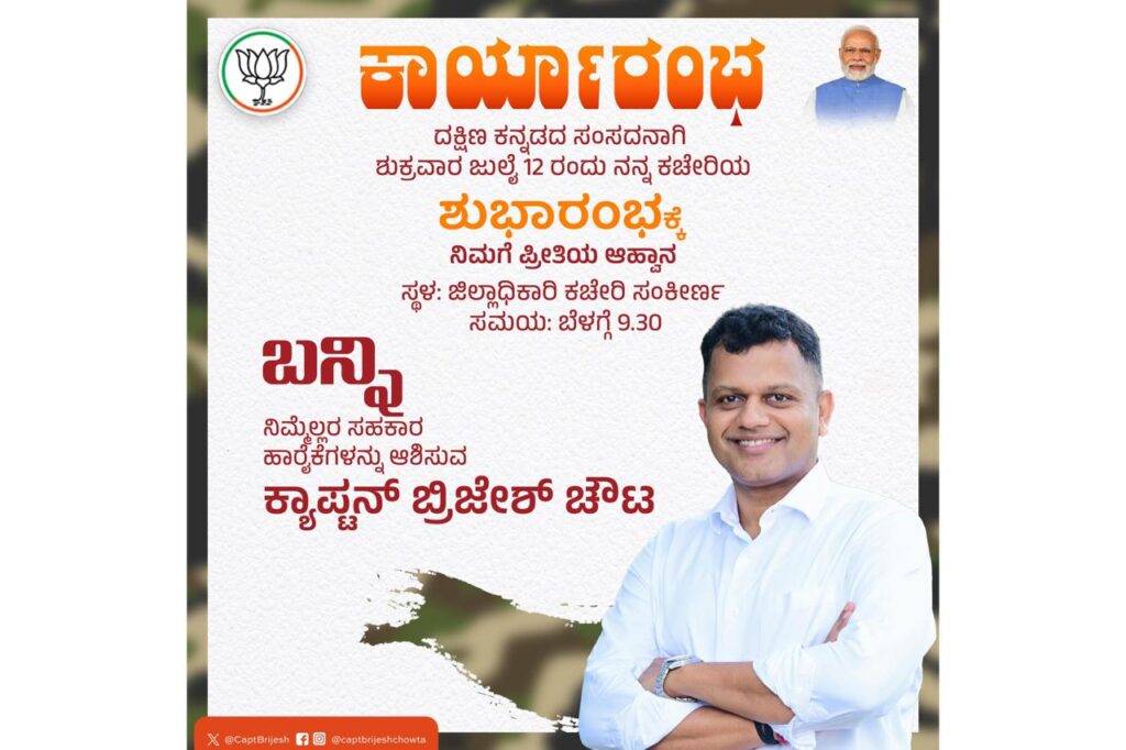 ಮಂಗಳೂರು : ದಕ್ಷಿಣ ಕನ್ನಡ ಜಿಲ್ಲಾ ಸಂಸದ ಕ್ಯಾಪ್ಟನ್ ಬ್ರಿಜೇಶ್ ಚೌಟ ಅವರ ಕಚೇರಿ ಉದ್ಘಾಟನಾ ಕಾರ್ಯಕ್ರಮ ಜು.12 ರಂದು ನಡೆಯಲಿದೆ.