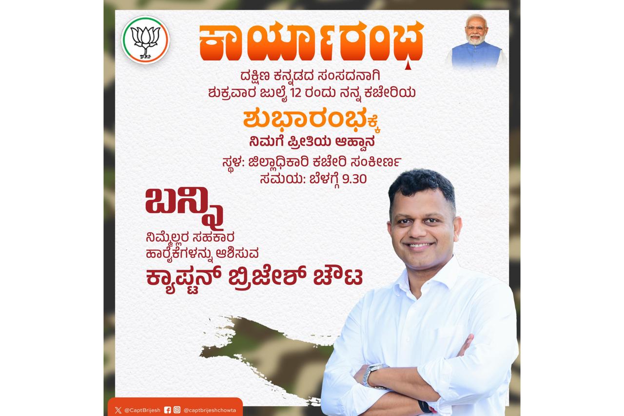 ಮಂಗಳೂರು : ದಕ್ಷಿಣ ಕನ್ನಡ ಜಿಲ್ಲಾ ಸಂಸದ ಕ್ಯಾಪ್ಟನ್ ಬ್ರಿಜೇಶ್ ಚೌಟ ಅವರ ಕಚೇರಿ ಉದ್ಘಾಟನಾ ಕಾರ್ಯಕ್ರಮ ಜು.12 ರಂದು ನಡೆಯಲಿದೆ.