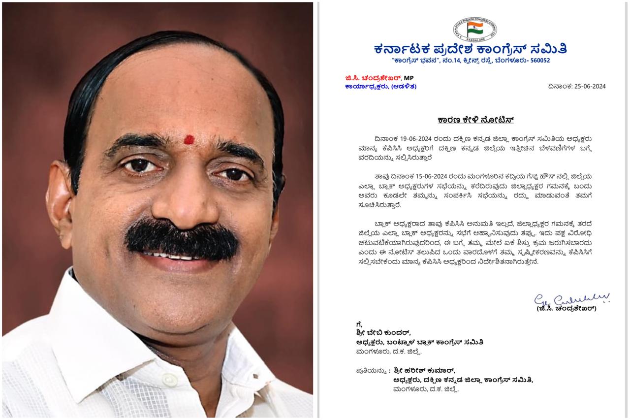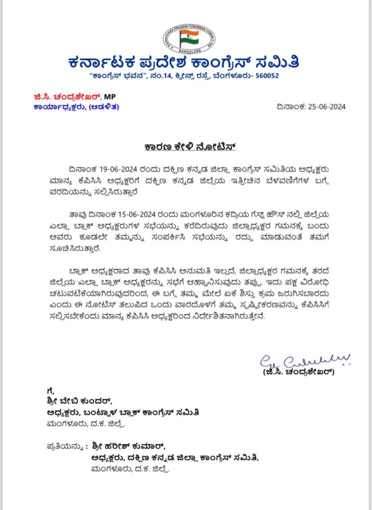 ಬ್ಲಾಕ್ ಅಧ್ಯಕ್ಷರು ಕೆಪಿಸಿಸಿ ಅನುಮತಿ ಇಲ್ಲದೆ, ಜಿಲ್ಲಾಧ್ಯಕ್ಷರ ಗಮನಕ್ಕೆ ತರದೆ ಜಿಲ್ಲೆಯ ಎಲ್ಲ ಬ್ಲಾಕ್ ಅಧ್ಯಕ್ಷರನ್ನು ಸಭೆಗೆ ಆಹ್ವಾನಿಸುವುದು ತಪ್ಪು, ಇದು ಪಕ್ಷ ವಿರೋಧಿ ಚಟುವಟಿಕೆಯಾಗಿರುವುದರಿಂದ, ಈ ಬಗ್ಗೆ ತಮ್ಮ ಮೇಲೆ ಯಾಕೆ ಶಿಸ್ತು ಕ್ರಮ ಜರುಗಿಸಬಾರದು ಎಂದು ಬಂಟ್ವಾಳ ಬ್ಲಾಕ್ ಕಾಂಗ್ರೆಸ್ ಅಧ್ಯಕ್ಷ ಬೇಬಿ ಕುಂದರ್ ಎಂಬವರಿಗೆ ಕಾರ್ಯಾಧ್ಯಕ್ಷರ ಜೆ.ಸಿ. ಚಂದ್ರಶೇಖರ್ ರವರು ನೋಟೀಸ್ ನೀಡಿದ್ದರು.
