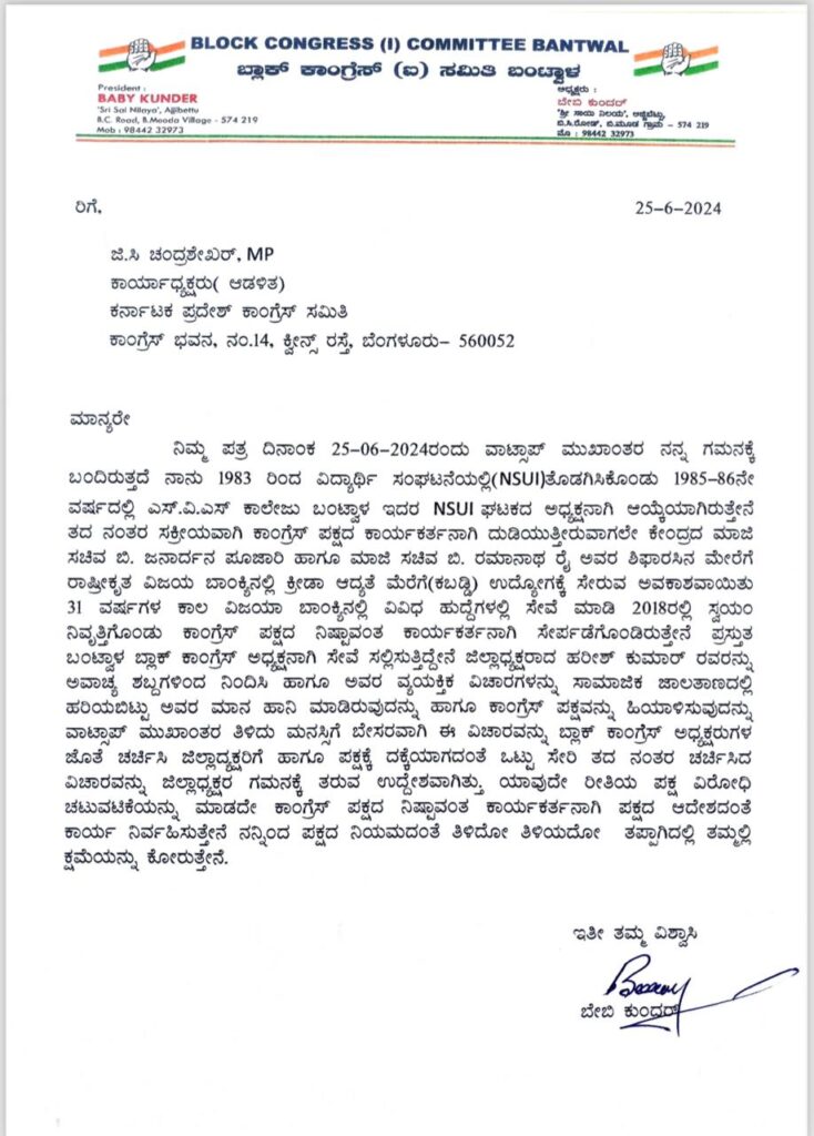 ಜಿಲ್ಲಾಧ್ಯಕ್ಷರಾದ ಹರೀಶ್ ಕುಮಾರ್ ರವರನ್ನು ಅವಾಚ್ಯ ಶಬ್ದಗಳಿಂದ ನಿಂದನೆ ಹಾಗೂ ವೈಯಕ್ತಿಕ ವಿಚಾರಗಳನ್ನು ಸಾಮಾಜಿಕ ಜಾಲತಾಣಗಳಲ್ಲಿ ಹರಿಯಬಿಟ್ಟು ಅವರ ಮಾನಹಾನಿ ಮಾಡಿರುವುದನ್ನು ಹಾಗೂ ಕಾಂಗ್ರೆಸ್ ಪಕ್ಷವನ್ನು ಹಿಯಾಳಿಸುವುದನ್ನು ವಾಟ್ಸಪ್ ಮುಖಾಂತರ ತಿಳಿದು ಮನಸ್ಸಿಗೆ ಬೇಸರವಾಗಿ ಈ ವಿಚಾರವನ್ನು ಬ್ಲಾಕ್ ಕಾಂಗ್ರೆಸ್ ಅಧ್ಯಕ್ಷರುಗಳ ಜೊತೆ ಚರ್ಚಿಸಿ, ಜಿಲ್ಲಾಧ್ಯಕ್ಷರಿಗೆ ಹಾಗೂ ಪಕ್ಷಕ್ಕೆ ಧಕ್ಕೆಯಾಗದಂತೆ ಒಟ್ಟು ಸೇರಿ ತದ ನಂತರ ಚರ್ಚಿಸಿದ ವಿಚಾರವನ್ನು ಜಿಲ್ಲಾಧ್ಯಕ್ಷರ ಗಮನಕ್ಕೆ ತರುವ ಉದ್ದೇಶವಾಗಿತ್ತು. ಯಾವುದೇ ರೀತಿಯ ಪಕ್ಷ ವಿರೋಧಿ ಚಟುವಟಿಕೆಯನ್ನು ಮಾಡದೆ ಕಾಂಗ್ರೆಸ್ ಪಕ್ಷದ ನಿಷ್ಠಾವಂತ ಕಾರ್ಯಕರ್ತನಾಗಿ ಪಕ್ಷದ ಆದೇಶದಂತೆ ಕಾರ್ಯ ನಿರ್ವಹಿಸುತ್ತೇನೆ. ನನ್ನಿಂದ ಪಕ್ಷದ ನಿಯಮದಂತೆ ತಿಳಿದೋ ತಿಳಿಯದೋ ತಪ್ಪಾಗಿದಲ್ಲಿ ಕ್ಷಮೆ ಇರಲಿ ಎಂದು ಬೇಬಿ ಕುಂದರ್ ಅವರು ಪತ್ರದ ಮೂಲಕ ಕ್ಷಮೆ ಕೋರಿದ್ದಾರೆ.