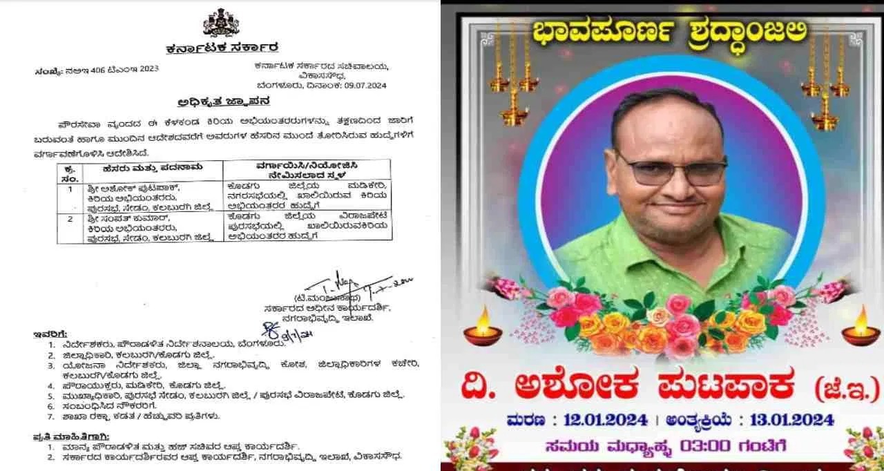 ನಗರಾಭಿವೃದ್ಧಿ ಇಲಾಖೆಯ ಕಿರಿಯ ಇಂಜಿನಿಯರ್ ಅಶೋಕ ಪುಟಪಾಕ ರನ್ನು ವರ್ಗಾವಣೆ ಮಾಡಿ ಯಡವಟ್ಟು ಮಾಡಿದೆ. ಅಶೋಕ ಪುಟಪಾಕ ಜನವರಿ 12 ರಂದು ಮೃತಪಟ್ಟಿದ್ದರು. ಜು.9 ರಂದು ಕೊಡಗಿಗೆ ವರ್ಗಾವಣೆ ಮಾಡಿ ಸರ್ಕಾರ ಆದೇಶ ಹೊರಡಿಸಿ ಲೇವಡಿಗೆ ಗುರಿಯಾಗಿದೆ.