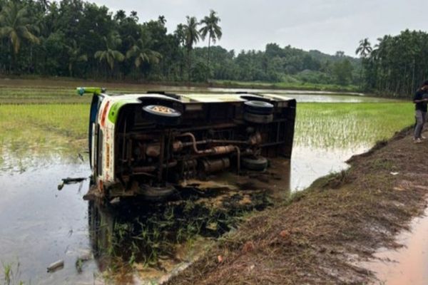 ಬಸ್ ಸಂಪೂರ್ಣವಾಗಿ ಗದ್ದೆಗೆ ಪಲ್ಟಿಯಾಗಿದ್ದು, ಪ್ರಯಾಣಿಕರು ಯಾವುದೇ ಗಾಯಗಳಿಲ್ಲದೆ ಪಾರಾಗಿದ್ದಾರೆ.