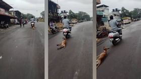 ಓರ್ವ ವ್ಯಕ್ತಿ ದ್ವಿಚಕ್ರ ವಾಹನಕ್ಕೆ ನಾಯಿಯನ್ನು ಕಟ್ಟಿ ಎಳೆದೊಯ್ದಿದ್ದಾನೆ.