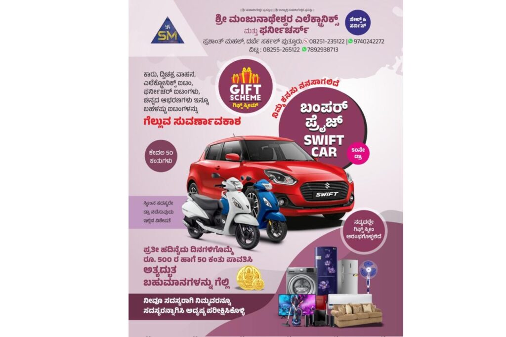 ಈ ಲಕ್ಕಿ ಸ್ಕೀಮ್ ನಲ್ಲಿ ಪ್ರತೀ ಹದಿನೈದು ದಿನಗಳಿಗೊಮ್ಮೆ 500 ರೂ. ಹಾಗೆ 50 ಕಂತು ಪಾವತಿಸ ಬೇಕಾಗಿದ್ದು, ವಿಜೇತ ಸದಸ್ಯರಿಗೆ ದ್ವಿಚಕ್ರ ವಾಹನ, ಎಲೆಕ್ಟೋನಿಕ್ಸ್ ಐಟಂ, ಫರ್ನೀಚರ್ ಐಟಂಗಳು, ಚಿನ್ನದ ಆಭರಣಗಳು ಇನ್ನೂ ಬಹಳಷ್ಟು ಐಟಂಗಳನ್ನು ಗೆಲ್ಲುವ ಅವಕಾಶವನ್ನು ಸಂಸ್ಥೆ ಕಲ್ಪಿಸಿದೆ. ಇಷ್ಟು ಮಾತ್ರವಲ್ಲದೆ ಬಂಪರ್ ಬಹುಮಾನವಾಗಿ ಸ್ವಿಪ್ಟ್ ಕಾರನ್ನು ಗೆಲ್ಲಬಹುದಾಗಿದೆ.