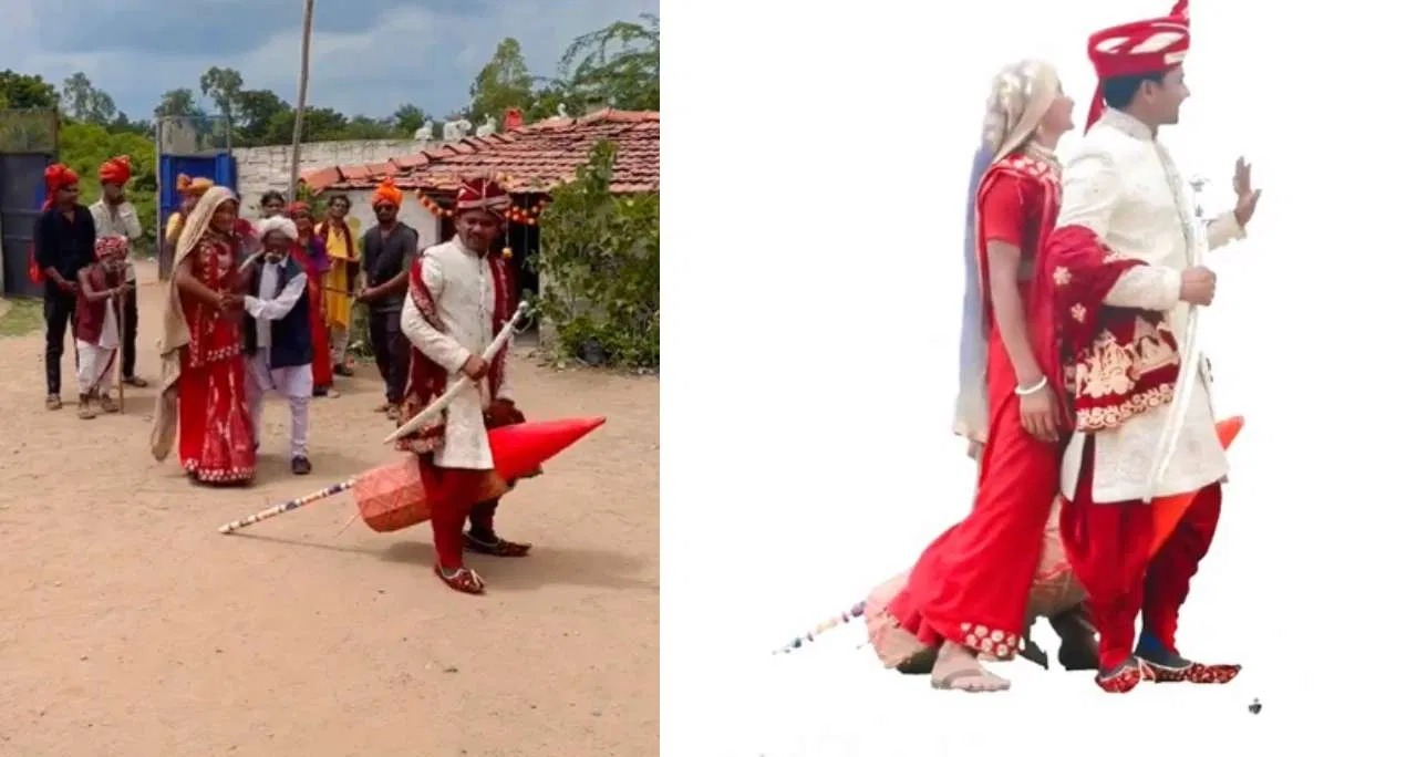 ವೈರಲ್ ಆಗಿರುವ ವೀಡಿಯೋದಲ್ಲಿ ವಧು- ವರರಿಬ್ಬರು ಕಾಗದದಲ್ಲಿ ಮಾಡಿರುವ ರಾಕೆಟ್ನಲ್ಲಿ ಕುಳಿತಿರುವುದನ್ನು ಕಾಣಬಹುದು. ಮತ್ತೊಬ್ಬ ವ್ಯಕ್ತಿ ಬಂದು ರಾಕೆಟ್ ಹಿಂಭಾಗಕ್ಕೆ ಬೆಂಕಿ ಹಚ್ಚಿದ್ದಾರೆ. ಬಳಿಕ ಮೂಲಕ ವಧು ವರರು ಹಾರಿ ಹೋಗುವಂತೆ ಎಡಿಟಿಂಗ್ ಮಾಡಲಾಗಿದೆ. ಸದ್ಯ ಈ ವೀಡಿಯೋ ವೈರಲ್ ಆಗುತ್ತಿದೆ.