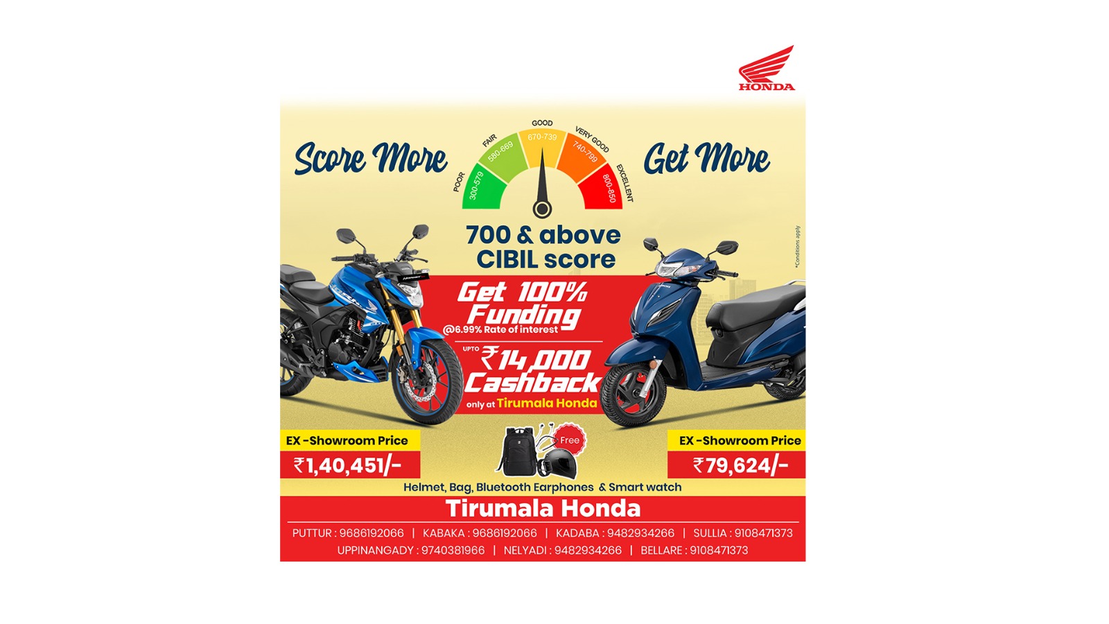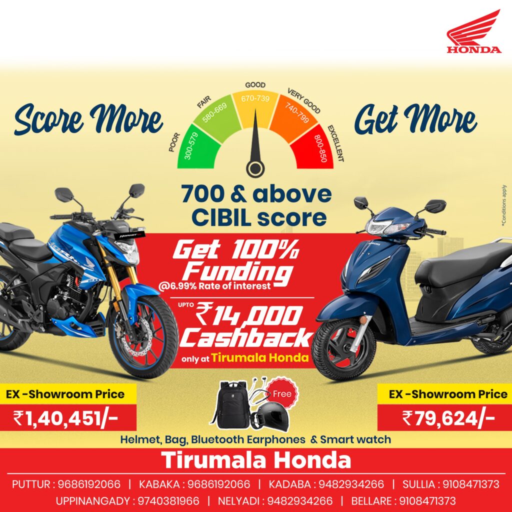 ತಿರುಮಲ ಹೋಂಡಾ ಗ್ರಾಹಕರಿಗಾಗಿ ವಿಶೇಷ ಆಫರ್ ನೀಡುತ್ತಿದ್ದು, 700+ ಸಿಬಿಲ್ ಸ್ಕೋರ್ ಇದ್ದರೆ ಸಾಕು 100% ಧನಸಹಾಯದ ಜೊತೆ 6.99% ಬಡ್ಡಿದರದಲ್ಲಿ ಕ್ಯಾಶ್ ಬ್ಯಾಕ್ ಜೊತೆ ಇಎಂಇ ಸೌಲಭ್ಯದ ಜೊತೆ ಹೊಸ ನೂತನ ವಾಹನವನ್ನು ನಿಮ್ಮದಾಗಿಸಿಕೊಳ್ಳಬಹುದು.