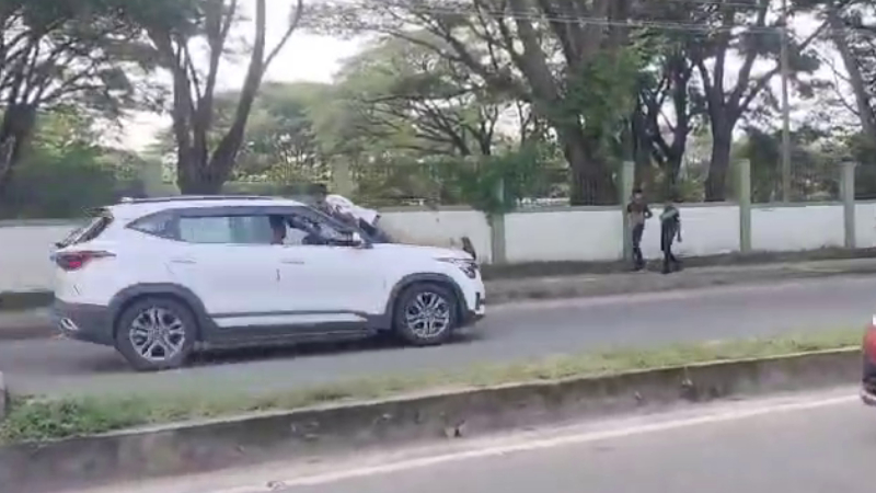 ಬಾನೆಟ್ ಮೇಲೆ ಪೊಲೀಸ್ ಸಿಬ್ಬಂದಿ ಇದ್ದರೂ ಚಾಲಕ ಕಾರು ನಿಲ್ಲಿಸದೆ ಸಹ್ಯಾದ್ರಿ ಕಾಲೇಜು ಗೇಟ್ನಿಂದ ಮತ್ತೂರು ರಸ್ತೆವರೆಗೂ ಸಾಗಿದ್ದಾನೆ. ಅಲ್ಲಿಂದ ಮುಂದೆ ಕಾರು ನಿಂತಿದೆ ಎಂದು ತಿಳಿದು ಬಂದಿದೆ. ಅದೃಷ್ಟವಶಾತ್ ಪೊಲೀಸ್ ಸಿಬ್ಬಂದಿ ಅಪಾಯದಿಂದ ಪಾರಾಗಿದ್ದಾರೆ.