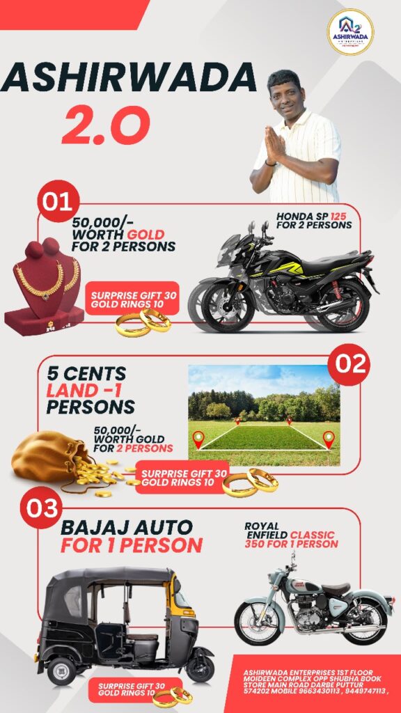ತನ್ನ ಪ್ರಥಮ ಯೋಜನೆಯ ಲಕ್ಕಿ ಡ್ರಾದಲ್ಲಿ ಇಬ್ಬರಿಗೆ ಎರಡು ಬೈಕ್ ಮತ್ತು ಇನ್ನಿಬ್ಬರು ಅದೃಷ್ಟಶಾಲಿಗಳಿಗೆ ಚಿನ್ನ ಗೆಲ್ಲುವ ಅವಕಾಶವನ್ನು ನೀಡಿದ್ದ ಆಶೀರ್ವಾದ್ ಸಂಸ್ಥೆ ಇದೀಗ ಆಶೀರ್ವಾದ 2.0ದ ಎರಡನೇ ಲಕ್ಕಿ ಡ್ರಾ ಯೋಜನೆಯಲ್ಲಿ ಒಬ್ಬ ಅದೃಷ್ಟಶಾಲಿಗೆ 5 ಸೆಂಟ್ಸ್ ನಿವೇಶನ ಸ್ಥಳವನ್ನು ತಮ್ಮದಾಗಿಸಿಕೊಳ್ಳುವ ಅವಕಾಶವನ್ನು ನೀಡುತ್ತಿದೆ. ಇದಕ್ಕೆ ನೀವು ಮಾಡಬೇಕಾಗಿರುವುದಿಷ್ಟೇ.. ಆಶೀರ್ವಾದದ ಈ ವಾಟ್ಸ್ಯಾಪ್ ಗ್ರೂಪನ್ನು ಜಾಯಿನ್ ಆಗಿ ಮತ್ತು ನಿಮ್ಮ ಅದೃಷ್ಟದ ಬಾಗಿಲನ್ನು ತೆರೆಯುವ ಮೂಲಕ ನಿವೇಶನದ ಆಶೀರ್ವಾದವನ್ನು ಪಡೆಯಿರಿ..!