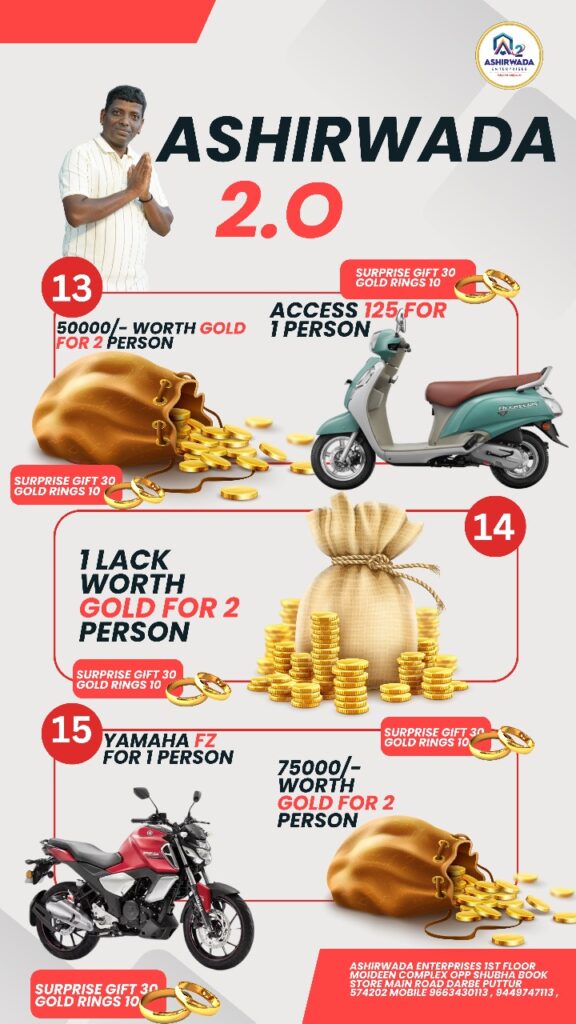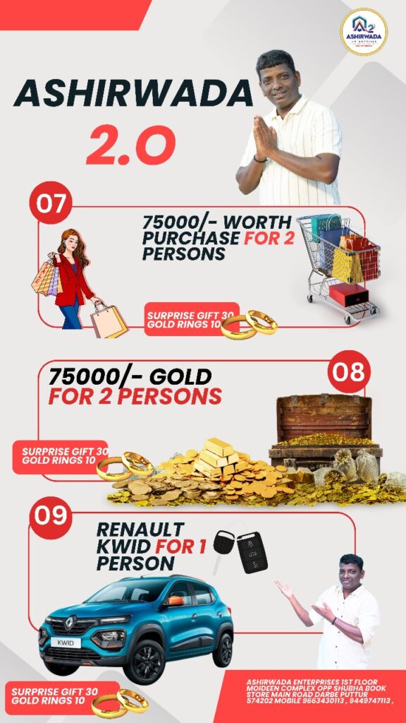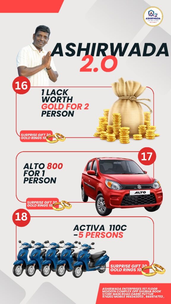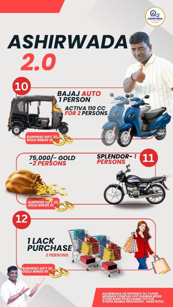 ದಕ್ಷಿಣ ಕನ್ನಡ ಜಿಲ್ಲೆಯ ಪುತ್ತೂರು ತಾಲೂಕಿನಲ್ಲಿ ಸಾವಿರಾರು ಗ್ರಾಹಕರ ಪ್ರೀತಿ ಸಂಪಾದಿಸಿಕೊಂಡಿರುವ ಆಶೀರ್ವಾದ ಸಂಸ್ಥೆ ಕಳೆದ ಹಲವಾರು ವರ್ಷಗಳಿಂದ ನಿಸ್ವಾರ್ಥ ಸೇವೆಯನ್ನು ತನ್ನ ಗ್ರಾಹಕರಿಗೆ ನೀಡುತ್ತಿದ್ದು, ಈ ಸಂಸ್ಥೆಯು ಕರ್ನಾಟಕ – ಕೇರಳದ ಗಡಿ ಭಾಗ ಸೇರಿದಂತೆ ವಿದೇಶದಲ್ಲಿಯೂ ಸಂತೃಪ್ತ ಗ್ರಾಹಕರನ್ನು ಹೊಂದಿದೆ. ಒಂದು ಚಿಕ್ಕ ಬದಲಾವಣೆ ಸಾಕು, ಜೀವನದ ಗತಿಯೇ ಬದಲಾಗಿ ಬಿಡುತ್ತದೆ. ಹಾಗಾದರೆ ಇನ್ಯಾಕೆ ತಡ, ಈಗಲೇ ಆಶೀರ್ವಾದ ಸಂಸ್ಥೆಯ ಗ್ರಾಹಕರಾಗಿ. ನಿಮ್ಮ ಅದೃಷ್ಟಕ್ಕೆ ಶೇಕಡಾ 100ರಷ್ಟು ಗ್ಯಾರಂಟಿ.