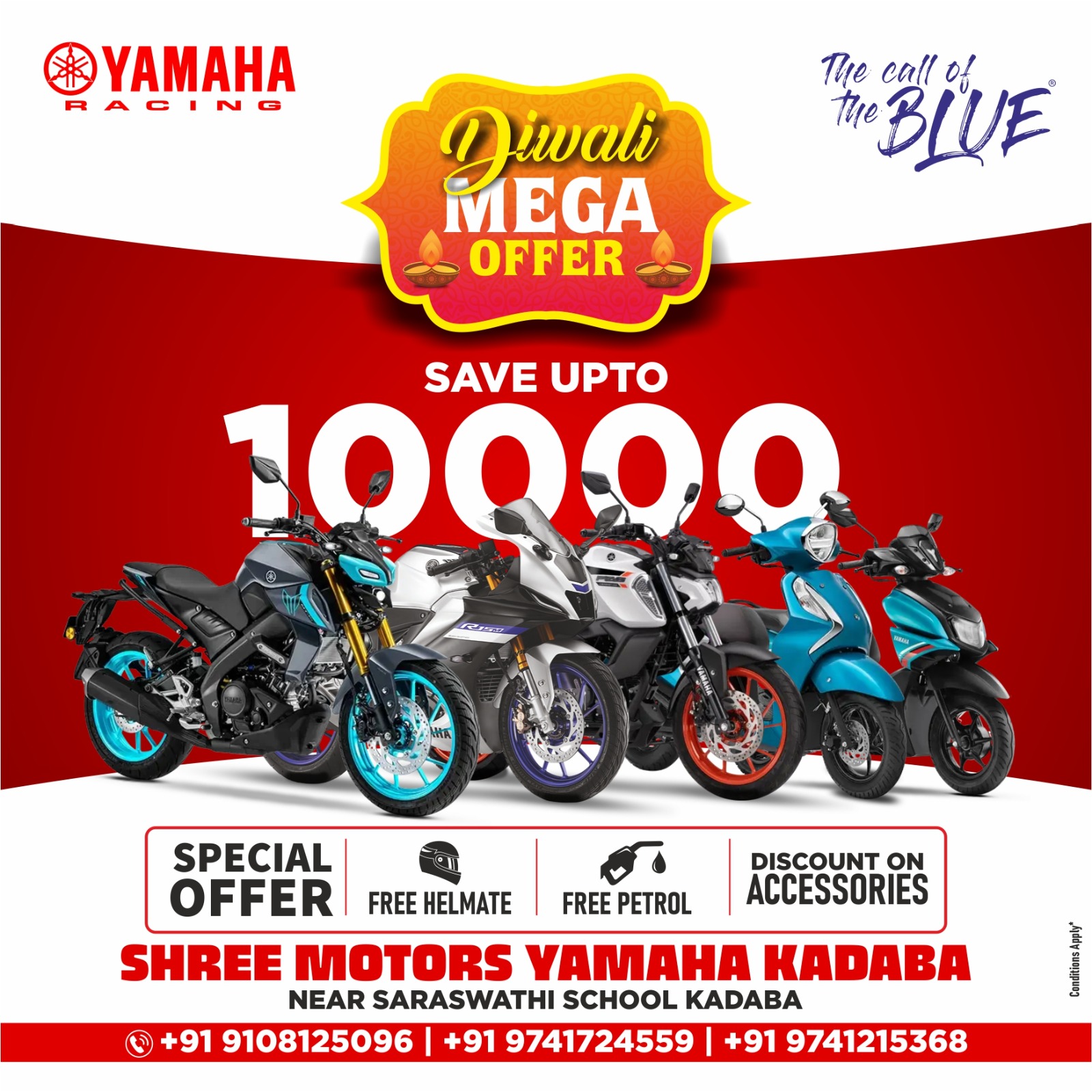 ಕಡಬ : ದೀಪಾವಳಿ ಹಬ್ಬದ ಪ್ರಯುಕ್ತ ಕಡಬದ ಶ್ರೀ ಮೋಟಾರ್ಸ್ ಯಮಹದಲ್ಲಿ ಗ್ರಾಹಕರಿಗೆ ಮೆಗಾ ಆಫರ್ ಲಭ್ಯವಿದೆ.
