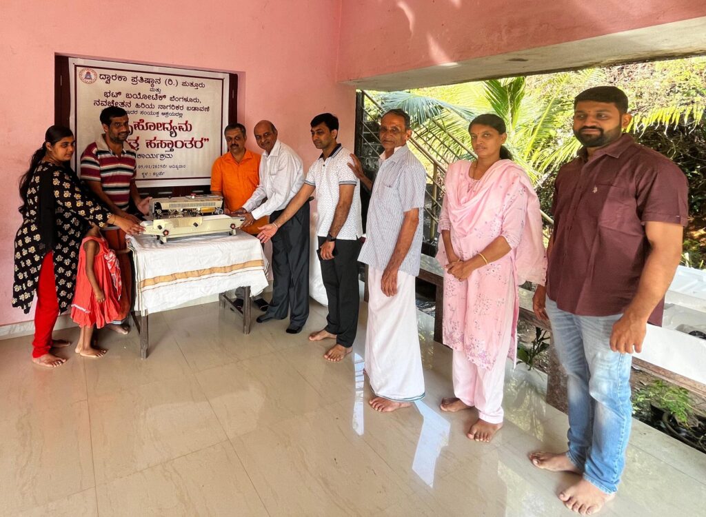 ಸ್ವಯಂ ಚಾಲಿತ ಯಂತ್ರವನ್ನು ನೀಡುವ ಮೂಲಕ ಸ್ವಾವಲಂಬಿ ಜೀವನ ನಡೆಸುವ ಕುಟುಂಬಕ್ಕೆ ಆಸರೆಯಾದಂತಹ ದ್ವಾರಕಾ ಪ್ರತಿಷ್ಠಾನದ (ರಿ) ಪುತ್ತೂರು ಇದರ ಸ್ಥಾಪಕರಾದ ಶ್ರೀಯುತ ಗೋಪಾಲಕೃಷ್ಣ ಭಟ್ ಹಾಗೂ ಭಟ್ ಬಯೋಟೆಕ್ ಬೆಂಗಳೂರು ಸಂಸ್ಥೆಯ ವ್ಯವಸ್ಥಾಪಕ ನಿರ್ದೇಶಕರಾದ ಶ್ರೀಯುತ ಶ್ಯಾಮ್ ಭಟ್ ಇವರು ಶ್ರೀ ರಾಮ ಪ್ರಸಾದ್ ಇವರ ಮುಂದಿನ ಸ್ವಾವಲಂಬಿ ಜೀವನಕ್ಕೆ ಹಾಗೂ ಅತೀ ಶೀಘ್ರದಲ್ಲಿ ಗುಣಮುಖರಾಗುವಂತೆ ಶುಭಹಾರೈಸಿದರು. ದ್ವಾರಕಾ ಪ್ರತಿಷ್ಠಾನ ದ ಉಪಾದ್ಯಕ್ಷರಾದ ಶ್ರೀಮತಿ ಅಶ್ವಿನಿ ಎನ್, ಕಾರ್ಯದರ್ಶಿಗಳಾದ ಶ್ರೀಯುತ ಅಮೃತಕೃಷ್ಣ, ಸಂಸ್ಥೆಯ ಸಿಬ್ಬಂದಿಗಳು ಹಾಗೂ ಭಟ್ ಬಯೋಟೆಕ್ ಸಂಸ್ಥೆಯ ನಿರ್ದೇಶಕರಾದ ಶ್ರೀಯುತ ಪವನ್ ಹಾಗೂ ಬಂಧುಮಿತ್ರರು ಈ ಧನ್ಯತಾ ಸಂದರ್ಭಕ್ಕೆ ಸಾಕ್ಷಿಯಾದರು.