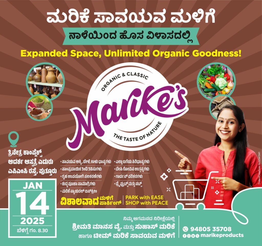 ಪುತ್ತೂರು : ಕಳೆದ 7 ವರ್ಷಗಳಿಂದ ಯಶಸ್ವಿಯಾಗಿ ನಡೆಯುತ್ತಾ ಬಂದಿರುವ ಮರಿಕೆ ಸಾವಯವ ಮಳಿಗೆಯು ಜ.14ರ ಮಕರ ಸಂಕ್ರಮಣದ ಶುಭ ದಿನದಂದು ಎಪಿಎಂಸಿ ರಸ್ತೆಯ ಆದರ್ಶ ಆಸ್ಪತ್ರೆಯ ಎದುರಿನಲ್ಲಿರುವ ‘ತ್ರಿನೇತ್ರ ಕಾಂಪ್ಲೆಕ್ಸ್‌’ಗೆ ಸ್ಥಳಾಂತರಗೊಂಡು ಶುಭಾರಂಭಗೊಳ್ಳಲಿದೆ.