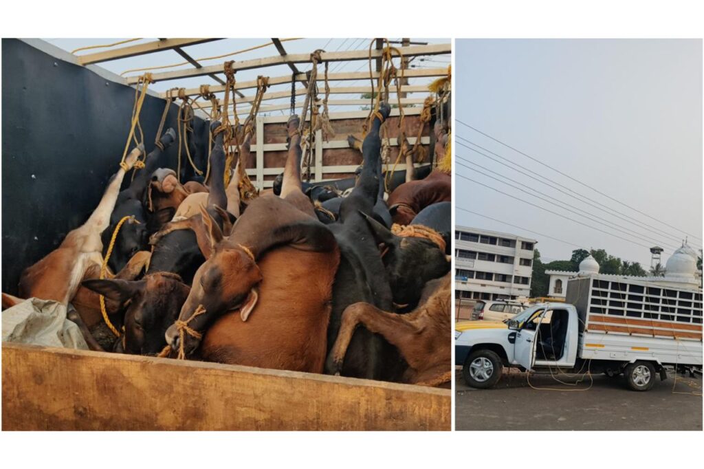 ಅಕ್ರಮವಾಗಿ ಗೋವುಗಳನ್ನು ಸಾಗಿಸಲಾಗುತ್ತಿದೆ ಎಂಬ ಖಚಿತ ಮಾಹಿತಿ ಮೇರೆಗೆ ವಾಹನವನ್ನು ತಡೆದು ಪರಿಶೀಲನೆ ನಡೆಸಿದ ವೇಳೆ ಗೂಡ್ಸ್ ವಾಹನದಲ್ಲಿ ಕಾಲುಗಳನ್ನು ಕಟ್ಟಿ ಅಮಾನುಷವಾಗಿ 25 ಗೋವುಗಳನ್ನು ಸಾಗಿಸುತ್ತಿರುವುದು ಬೆಳಕಿಗೆ ಬಂದಿದೆ.