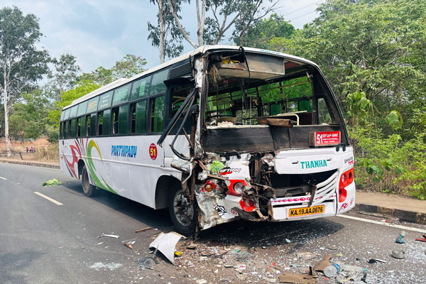 ಗುಡ್ಡ ಪ್ರದೇಶಕ್ಕೆ ಬೆಂಕಿ ಬಿದ್ದ ಪರಿಣಾಮ ರಸ್ತೆಯುದ್ದಕ್ಕೂ ದಟ್ಟವಾದ ಹೊಗೆಯು ಆವರಿಸಿ ಎರಡು ಬಸ್ಸುಗಳ ನಡುವೆ ಮುಖಾಮುಖಿ ಡಿಕ್ಕಿ ಸಂಭವಿಸಿದ ಘಟನೆ ಮಂಗಳೂರು ವಿಶ್ವವಿದ್ಯಾಲಯದ ಮಹಿಳಾ ವಸತಿ ನಿಲಯದ ಬಳಿಯ ರಸ್ತೆಯಲ್ಲಿ ಸಂಭವಿಸಿದೆ.